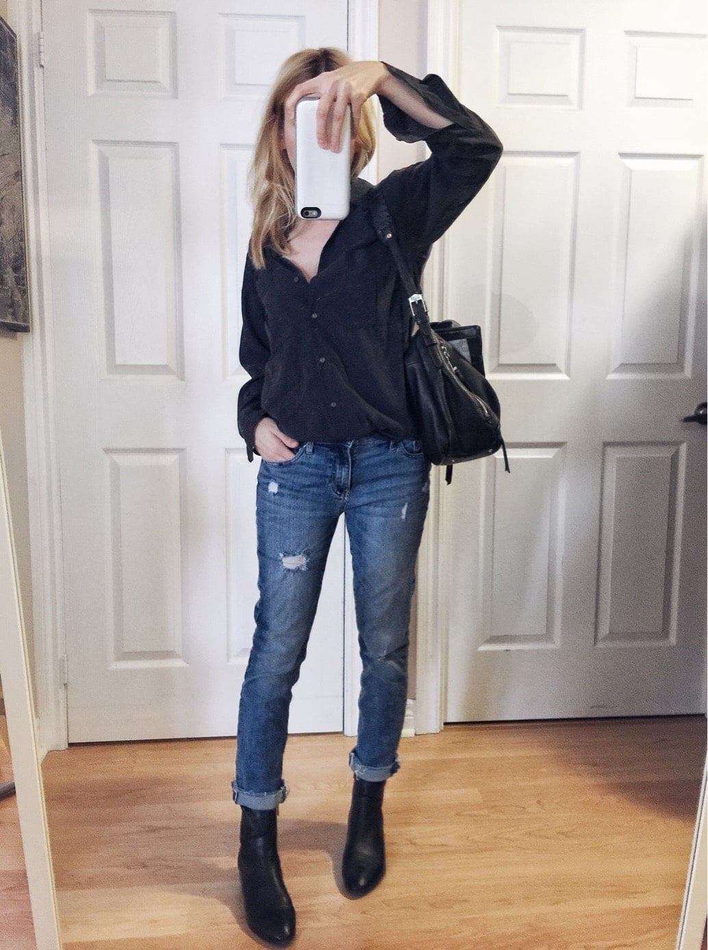 Outfit 1 – Black Blouse | girlfriend jeans | socks boots | purse |