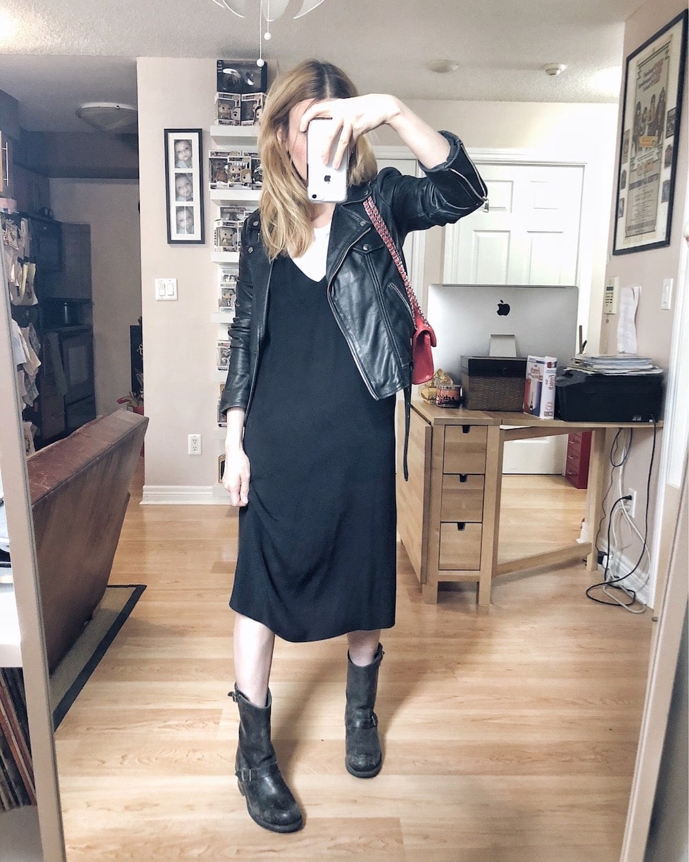 Outfit 2 – T-shirt | Slip Dress | Leather Jacket (similar) | Purse | Boots |